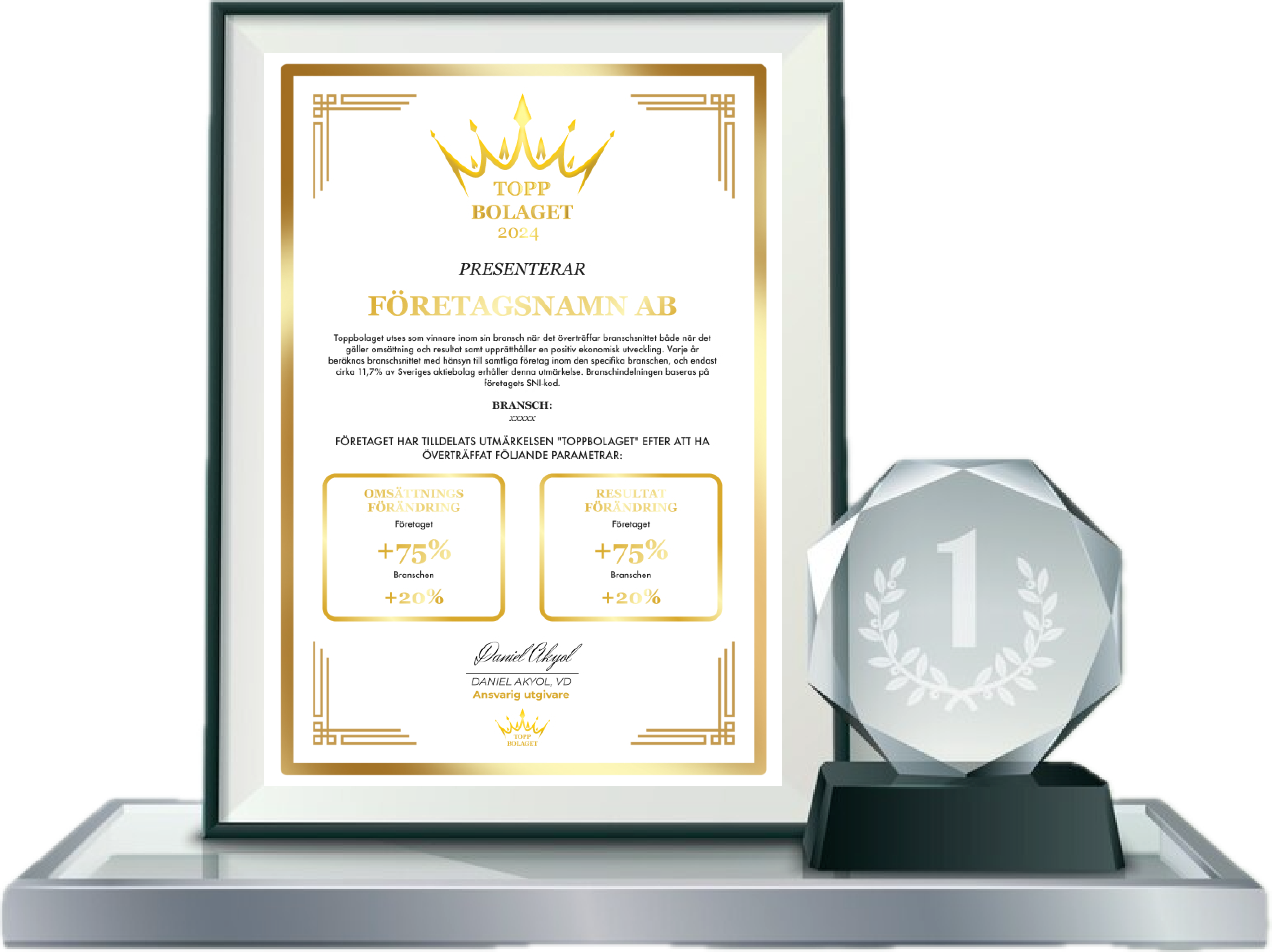 Ge din arbetsplats en touch av elegans och erkännande med vårt prestigefyllda Diplom för endast 2995 kr! Låt det pryda er reception, butik eller kontor och skapa en atmosfär av framgång och uppskattning. Detta diplom är inte bara en hyllning till ert ledarskap och engagerade personal, utan också ett stort tack till era lojala kunder. Med en träram i glänsande guldfärg blir detta diplom en imponerande och minnesvärd del av er företagsprofil. Visa er uppskattning och förstärk er professionella image med vårt exklusiva Diplom - det perfekta sättet att demonstrera er topposition inom branschen!